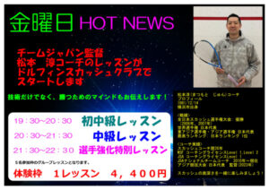 この度 ドルフィンスカッシュクラブにて 毎週金曜日に松本 純コーチの